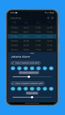Selain alarm manual, aplikasi juga dapat mengirimkan notifikasi otomatis mengenai waktu matahari terbit dan terbenam secara real-time. Informasi ini membantu pengguna untuk selalu siap menikmati momen terbaik dalam sehari.